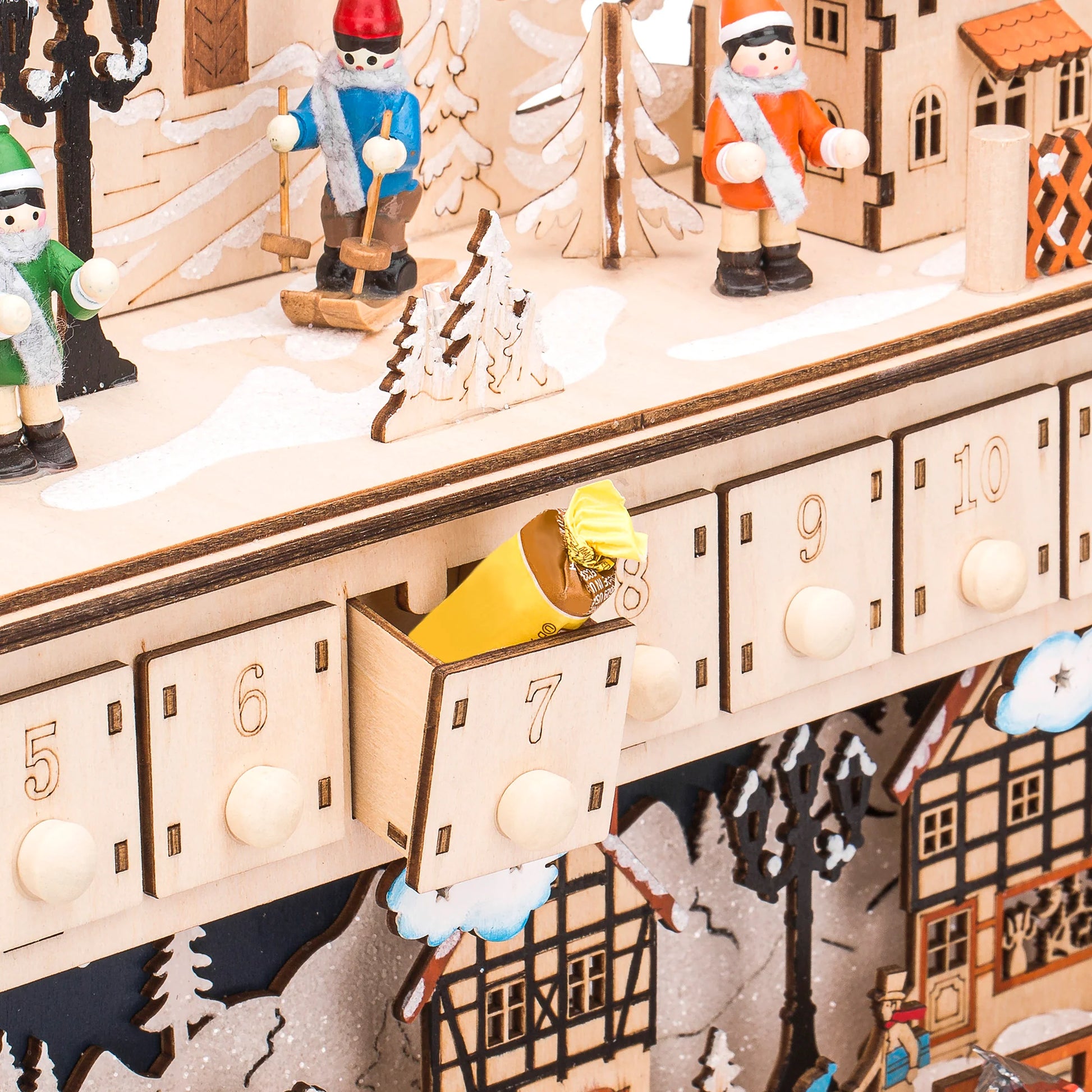 - INTRICATE DETAIL: Enjoy details like Santa riding in his sleigh and a holiday countdown that includes small drawers with engraved numbers to count the days until Christmas